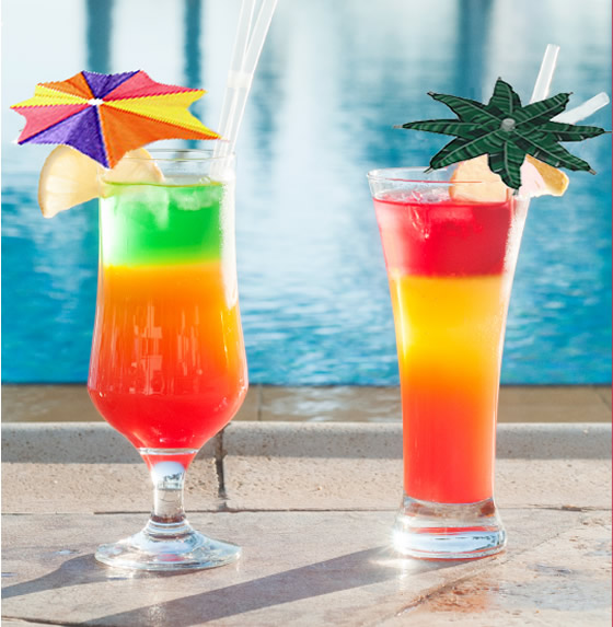 long, cool drinks with layered colours of fruit juices and umbrellas on