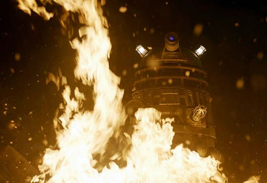 She couldn’t. She just didn’t feel quite the same way about Daleks that everyone else did. She hated the sight of the huge glowing fire with its distinct shape. As she turned away there was a cracking noise and the wooden eyestalk succumbed to the fire and fell.