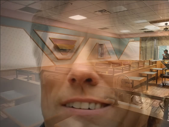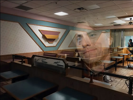 around in less than enthusiasm at the interior of a disused burger restaurant.